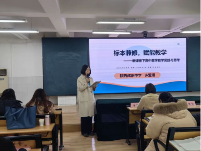 陕西省优秀班主任、陕西省高中数学第九批学科带头人、许爱瑛名师工作室主持人许爱瑛老师带来《标本兼修 赋能教学——新课标下高中数学教学的实践与思考》专题报告。报告围绕“核心素养落地”的核心,从“精研课标、读懂课本、创新教法、学用结合”四个维度,结合实际案例分享了新课标背景下高中数学教学的优化策略,为参会教师提供了可借鉴的教学实践路径。