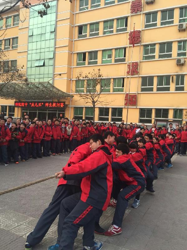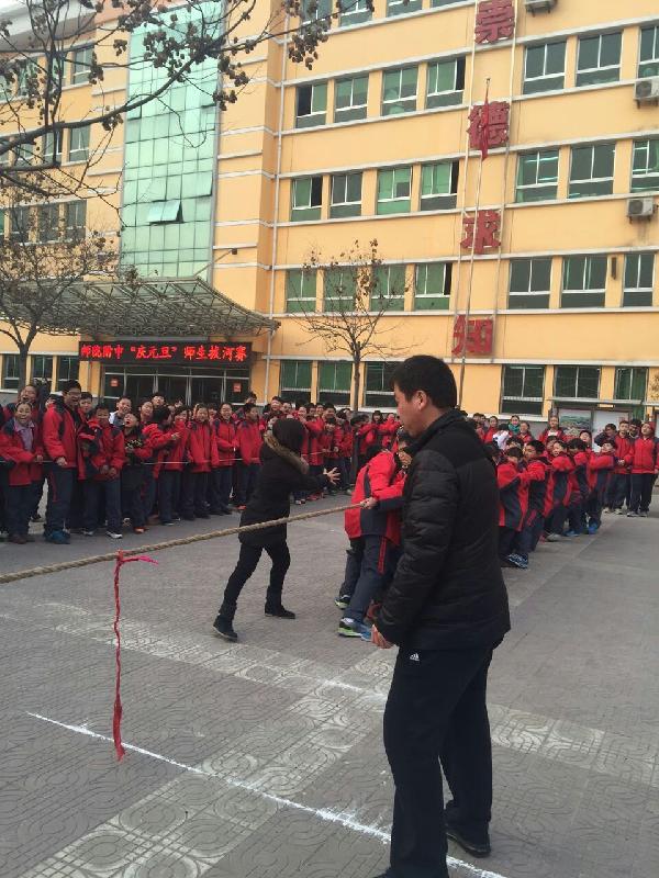 2015年12月28日下午,由我校政教处、团总支、体艺组联合主办的“庆元旦”师生拔河赛在我校教学楼南北两边举行。此次比赛以促进班级交流为宗旨,丰富课余生活为目的,用比赛的形式为师生提供了展现风采的机会。通过比赛,发扬了团队精神,增强了同学、同事之间的凝聚力。